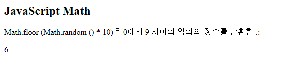 <p>Math.floor (Math.random () * 10)은 0에서 9 사이의 임의의 정수를 반환함 .:</p>